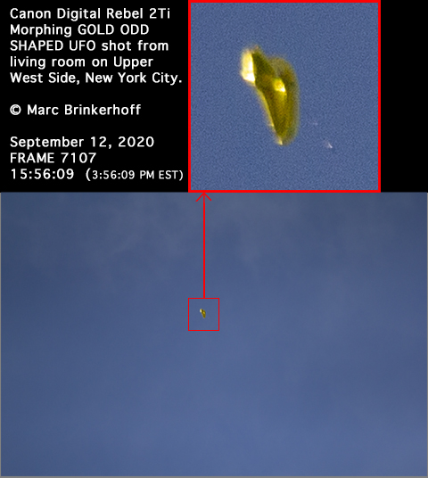 On Saturday, September 12, 2020, around 3:56PM, I was called telepathically to my living room windows to, "Come and Look out to the sky directly in front of me." When I did, I immediately noticed a shimming gold UFO. It was a strange shape that was pulsating and shimmering in a brilliant metallic gold as I observed it with my binoculars. It seemed like multiple orbs when I first looked at. I picked up my camera and sent a telepathic "Thank you!", to my friends of the Ashtar Command and Crew members in the ship. I knew it was a ship from the Ashtar Intergalactic Command, and my crew told me the name of the Captain was Alevron. As I took one picture, the Spaceship (UFO) started moving quickly above my head over my building which is why you can see the air conditioner above me in the last two frames before it flies out of view. I photographed for less than one minute before it was gone. This is a strange shape I have never seen before and frankly was quite amazed when I saw how dramatically it morphed in the last 5 frames.